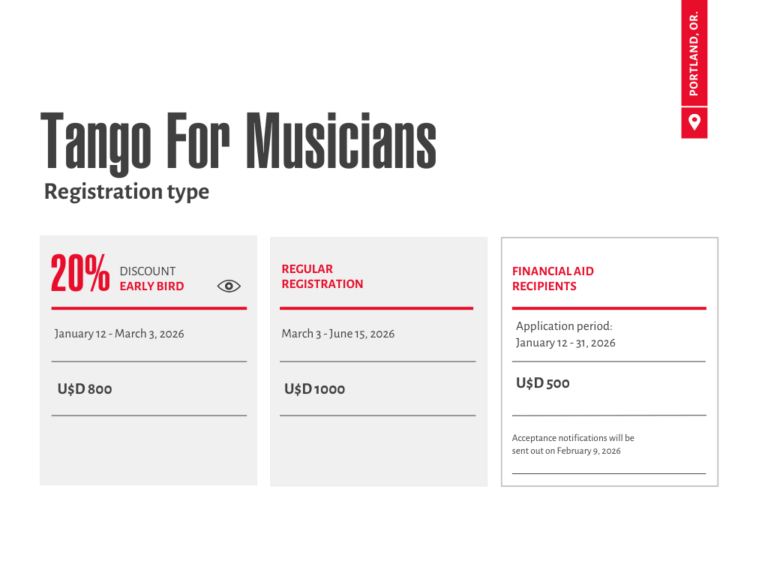 The 2026 edition of Tango for Musicians at Reed College will take place from June 21-28, 2026 in Portland, Oregon.
